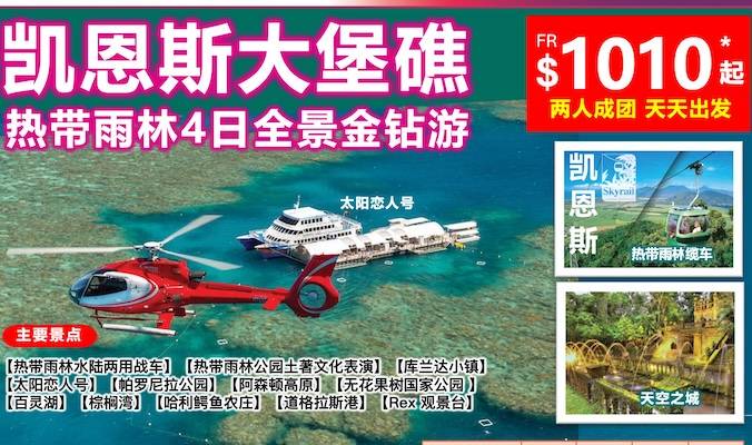 ** 10分钟直升飞机大堡礁观光 : $199/人